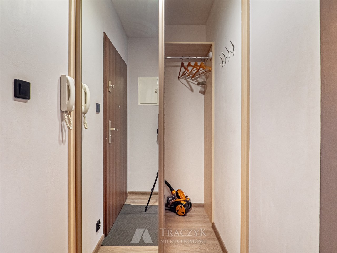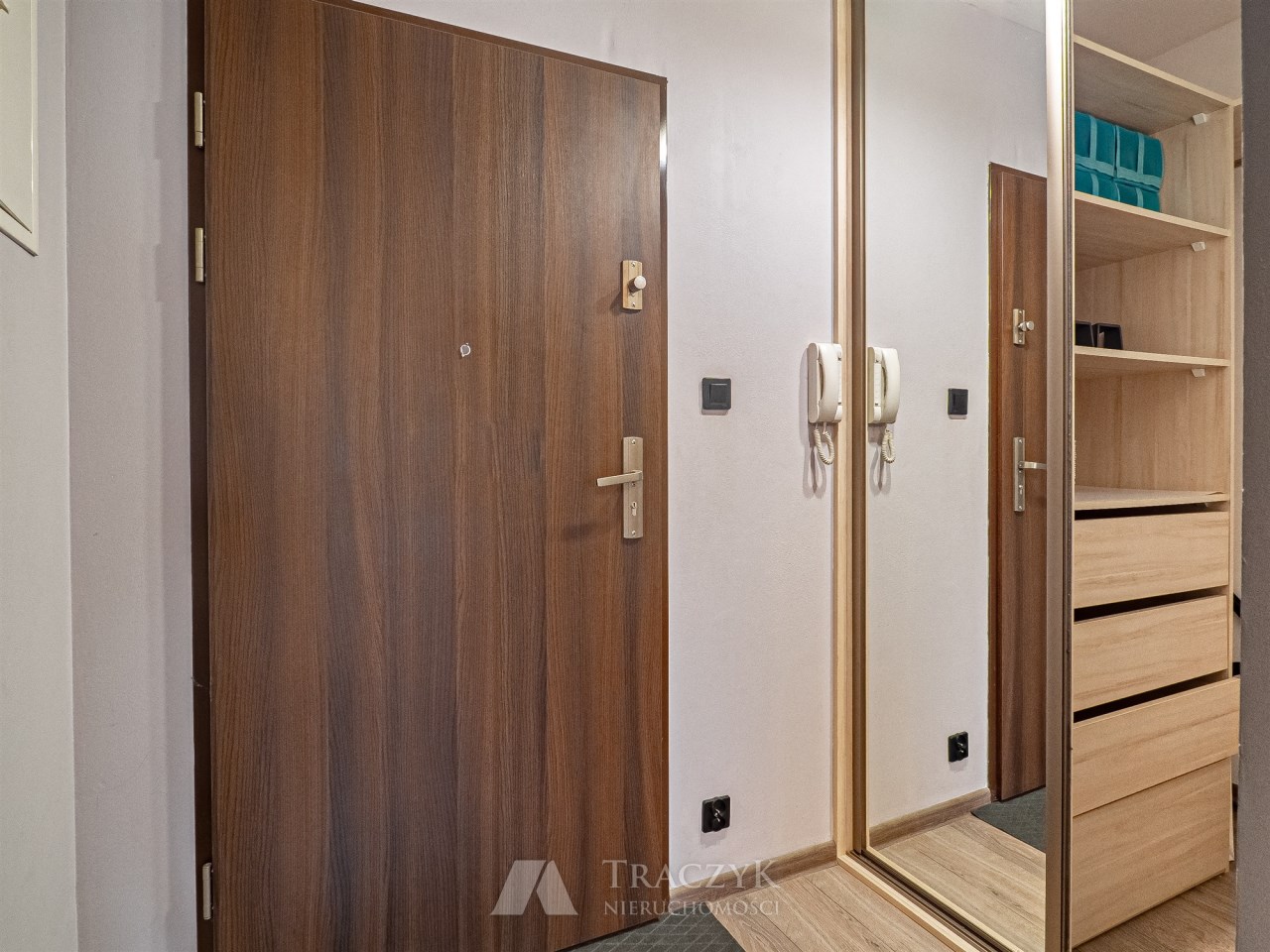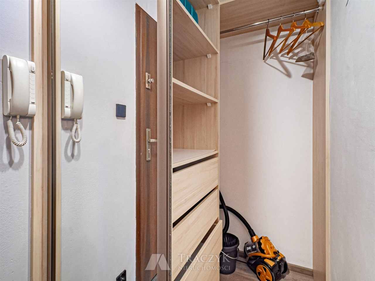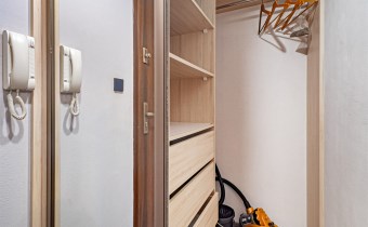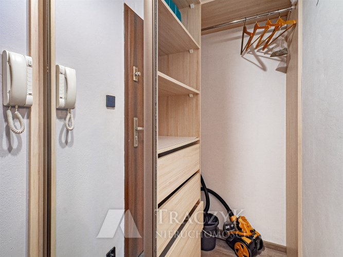 • przedpokój z garderobą: regał z szufladami oraz wieszaki na ubrania,