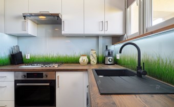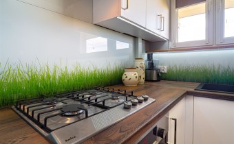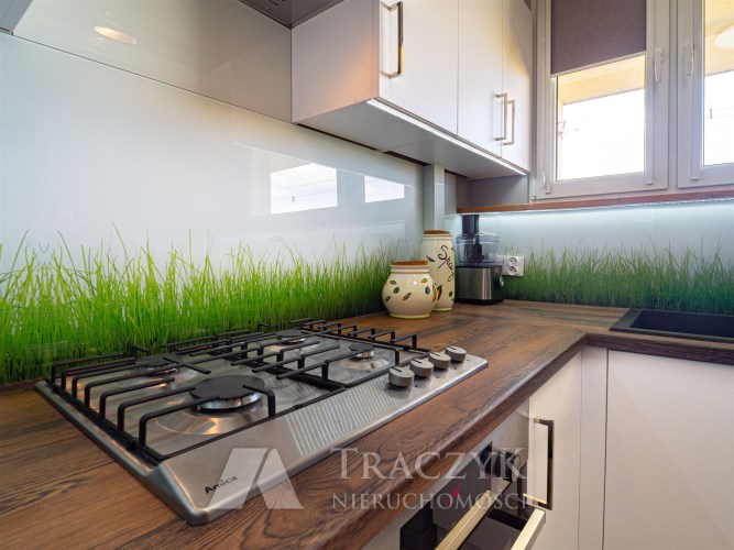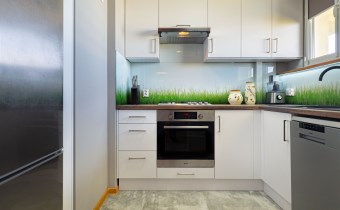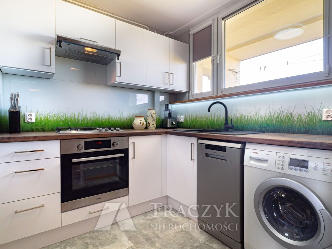- kuchnia jasna z oknem, w której znajdują się meble na wymiar oraz sprzęty AGD jak: lodówko-zamrażarka w zabudowie marki Mastercook, wbudowany piekarnik elektryczny AMICA, płyta gazowa AMICA, zmywarka AMCIA, pralka BOSCH, okap AMICA oraz bogate drobne wyposażenie (zastawa stołowa, sztućce, zestaw garnków, dwie sokowirówki Cookworks i Blaupunkt, wyciskarka do owoców, itp.). Zarówno meble kuchenne, jak i sama wyspa ofertują dużą ilość miejsca do przechowywania,