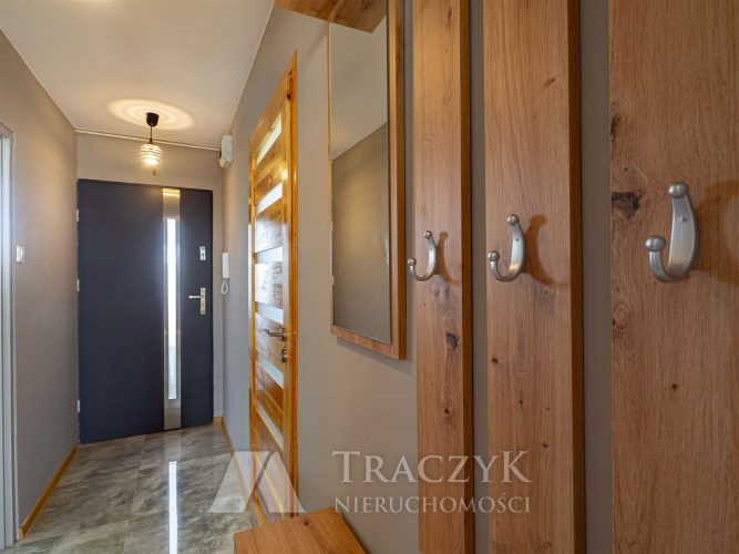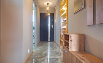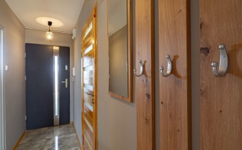 - przedpokój, z szafkami oraz wieszakiem ubraniowym i lustrem,