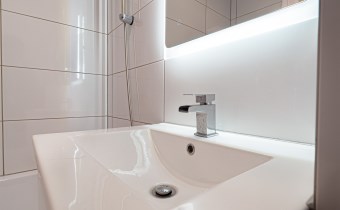 - łazienka z wanną i słuchawką prysznicową, umywalka z szafką podumywalkową, dobrze doświetlone lustro, wc,