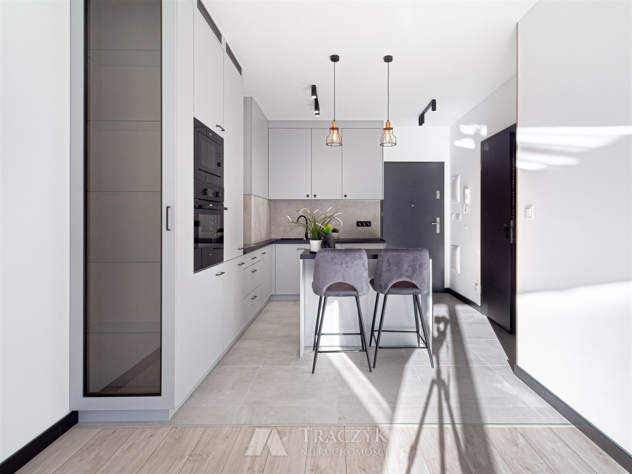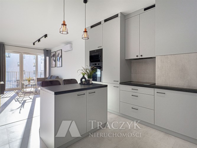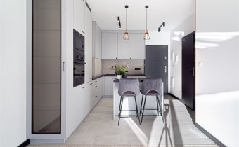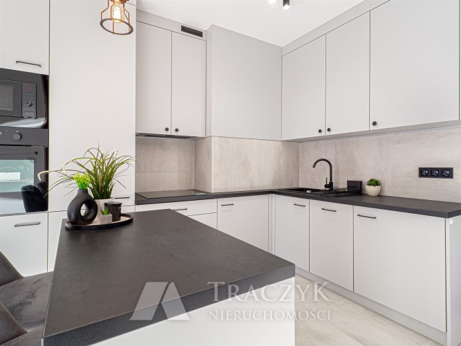 - aneksu kuchennego z wyspą oraz z dużą ilością szafek do przechowywania sprzętów kuchennych . Aneks kuchenny wyposażony został we wszystkie niezbędne sprzęty AGD: lodówko-zamrażalkę w zabudowie, indukcję, piekarnik, zmywarkę. W aneksie również pralka.