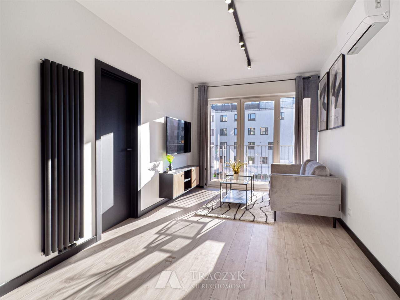 - dobrze oświetlonego salonu wyposażonego w sofę, stolik kawowy, szafkę rtv i telewizor. Z salonu wyjście na balkon.