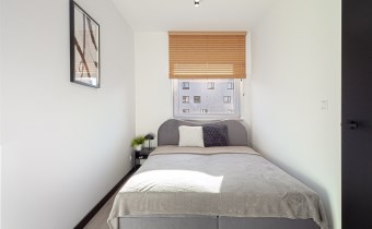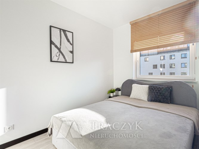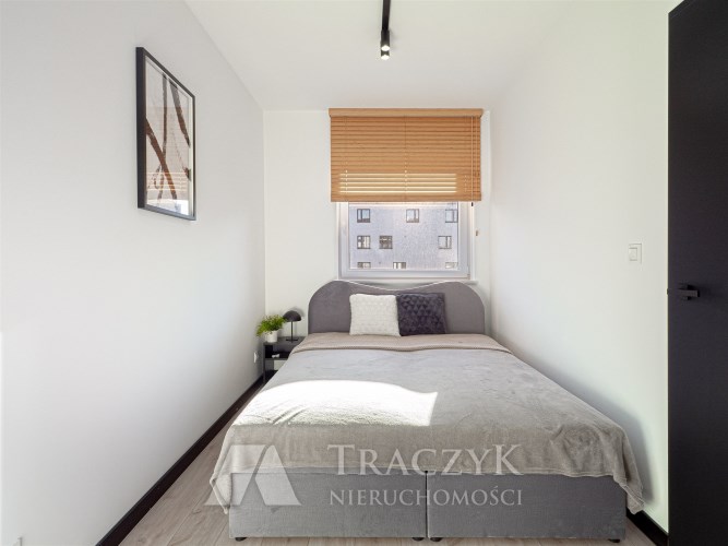- przytulnej sypialni z łóżkiem podwójnym. Na oknach zamontowane są rolety. W sypialni znajduje się również garderoba z toaletką i lustrem.