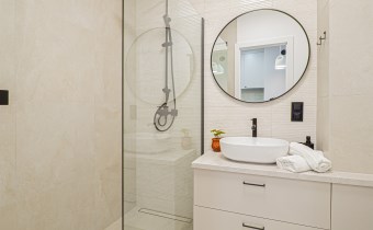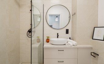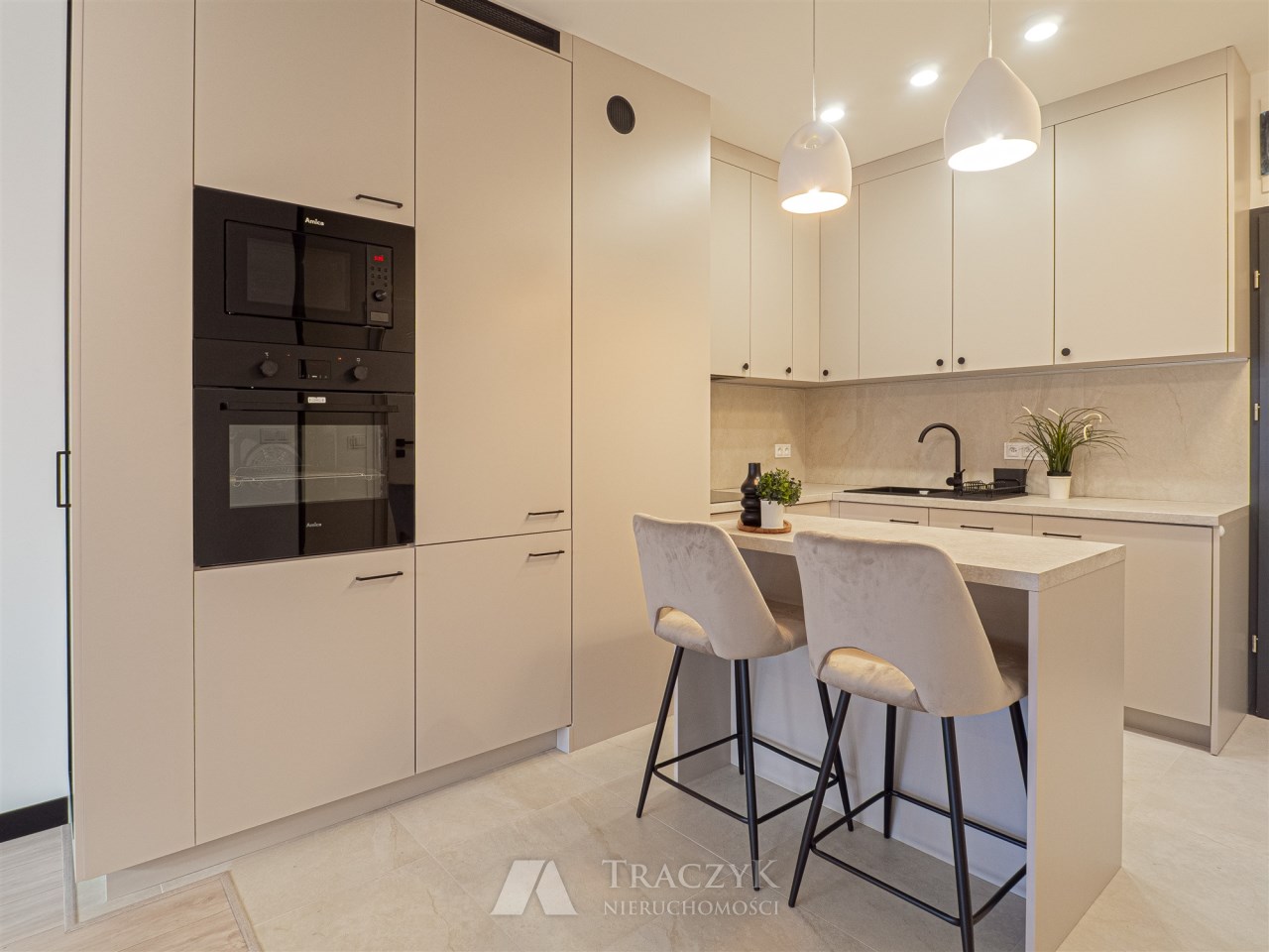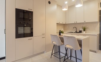 - aneksu kuchennego z wyspą oraz z dużą ilością szafek do przechowywania sprzętów kuchennych . Aneks kuchenny wyposażony został we wszystkie niezbędne sprzęty AGD: lodówko-zamrażalkę w zabudowie, indukcję, piekarnik, zmywarkę. W aneksie również pralka.