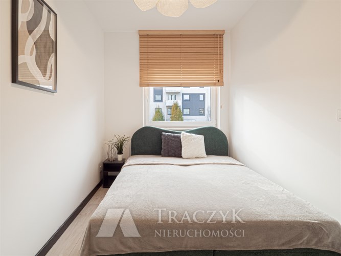 - przytulnej sypialni z łóżkiem podwójnym. Na oknach zamontowane są rolety. W sypialni znajduje się również garderoba z toaletką i lustrem.