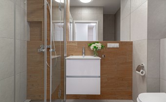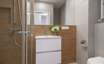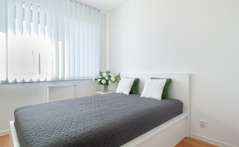 Mieszkanie jest bardzo jasne i przestronne. Składa się z sypialni z dużym podwójnym łóżkiem oraz trzydrzwiową szafą, salonu z jadalnią i aneksem kuchennym, który został przez Właścicieli wyposażony w zestawy talerzyk sztućców, szklanek i kuchennych narzędzi, łazienki z prysznicem i pralką oraz przedpokoju z dużą szafą służącą zarówno do przechowywania odzieży wierzchniej, jak i jako schowek.