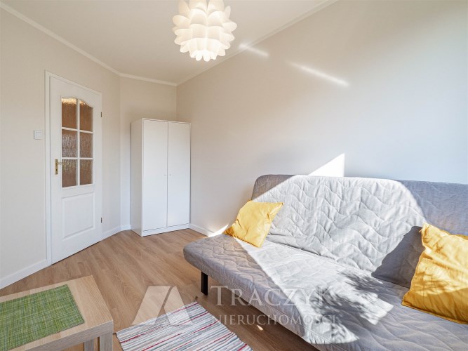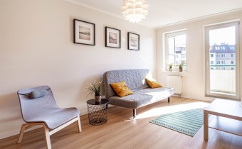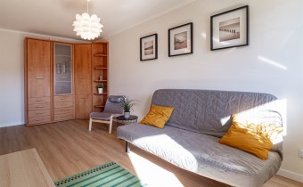 Mieszkanie znajduje się na 4 piętrze w budynku z windą. Jest w pełni umeblowane i wyposażone we wszystkie niezbędne sprzęty, gotowe do natychmiastowego zamieszkania. Dodatkowo, w mieszkaniu dostępne są udogodnienia takie jak odkurzacz, żelazko, deska do prasowania i suszarka do prania.