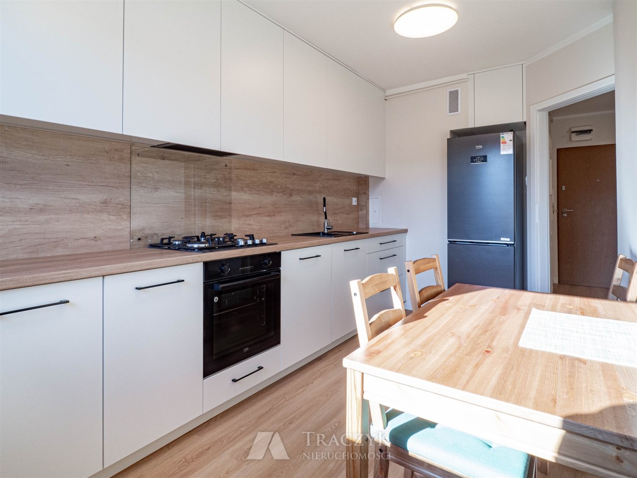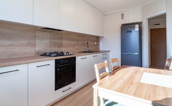 • Kuchnia: przestronna z pełnym wyposażeniem, z meblami w zabudowie, piekarnikiem, zmywarką, płytą kuchenną, okapem kuchennym, lodówką z zamrażarką oraz stołem dla czterech osób,