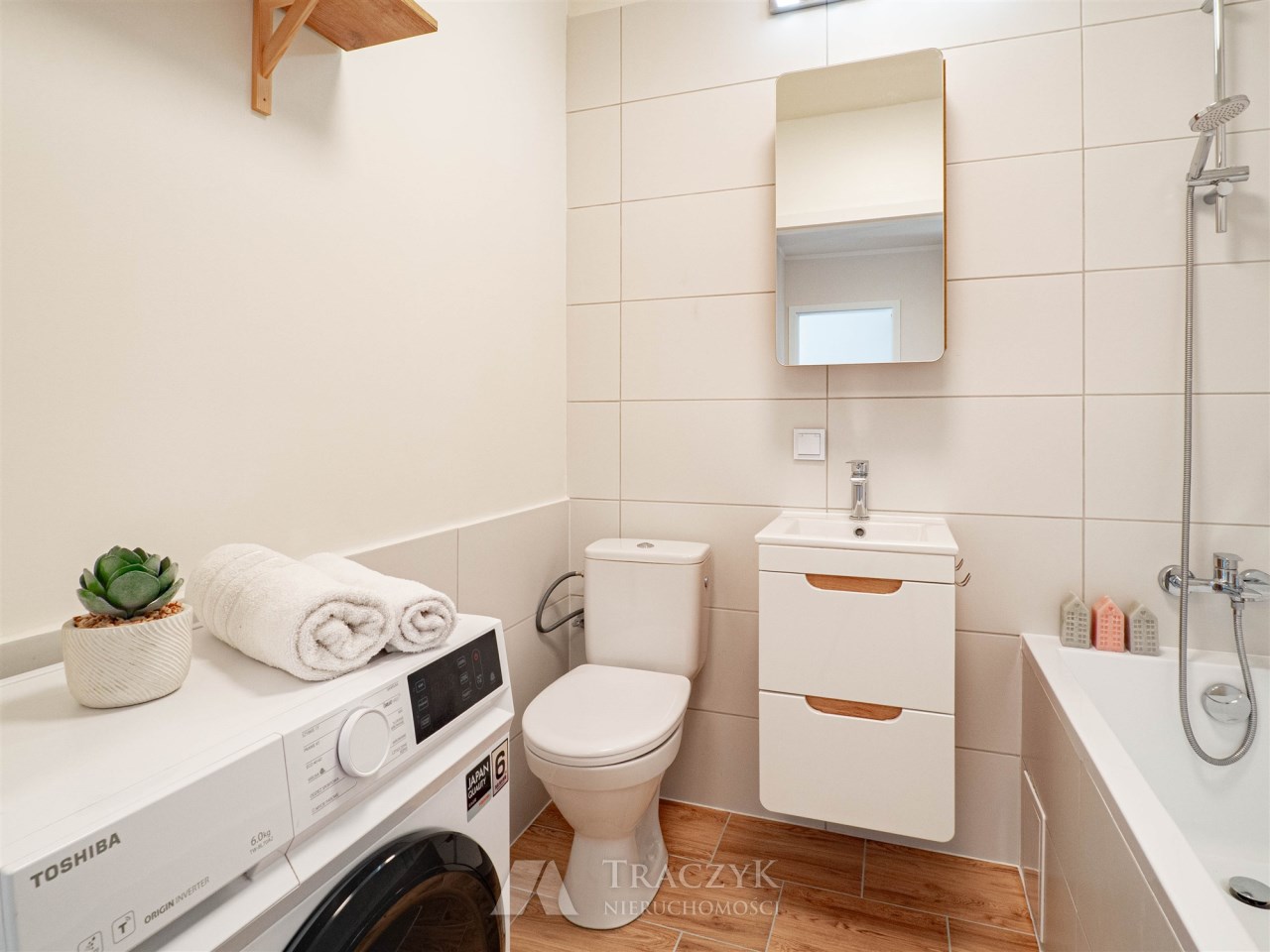 • Łazienka: funkcjonalna łazienka z WC, wanną, umywalką z szafką oraz oświetloną lustrzaną szafką. W łazience znajduje się także pralka,