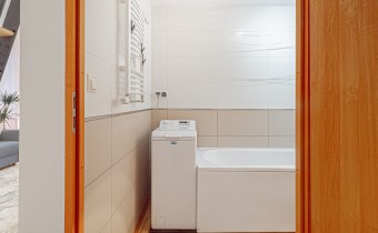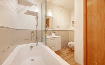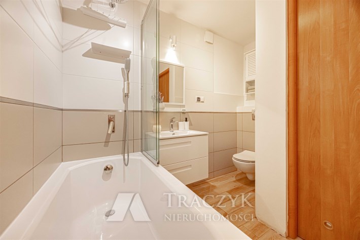 - łazienka z wanną z funkcją prysznica, umywalka, szafki do przechowywania, WC