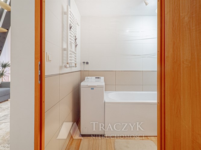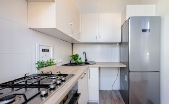 - oddzielna kuchnia z pełną zabudową i sprzętem AGD (w tym: lodówko zamrażalka, piekarnik elektryczny, płyta gazowa, zlewozmywak),