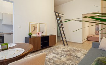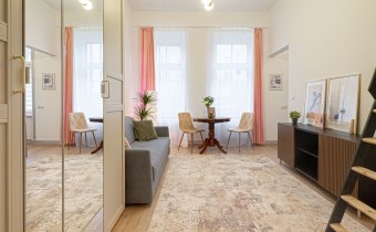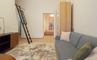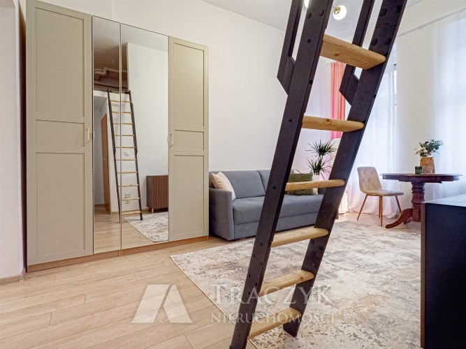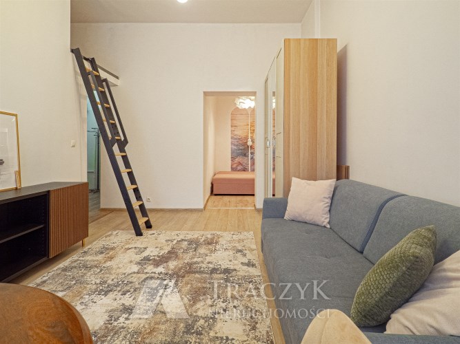 Kawalerka/dwu pokojowe mieszkanie z wydzieloną strefą sypialnianą, położona na wysokim parterze odrestaurowanej kamienicy.