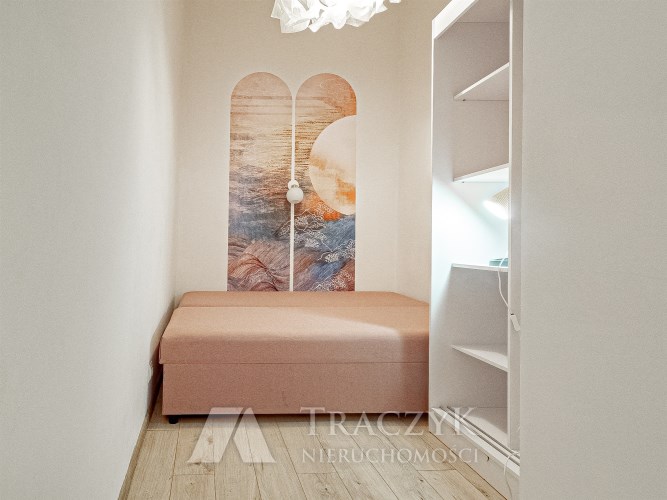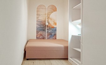 - przytulna wnęka sypialniana (wyposażenie: tapczan, regał z pólkami),