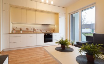 - aneks kuchenny, w której znajdują się meble na wymiar oraz sprzęty AGD jak: lodówko-zamrażarka w zabudowie marki Whirpool, wbudowany piekarnik elektryczny Whirpool, płyta indukcyjna Whirpool, zmywarka Whirpool, okap oraz drobne wyposażenie. Meble kuchenne ofertują bardzo dużą ilość miejsca do przechowywania.