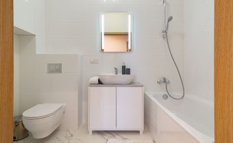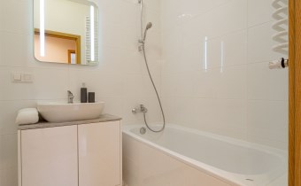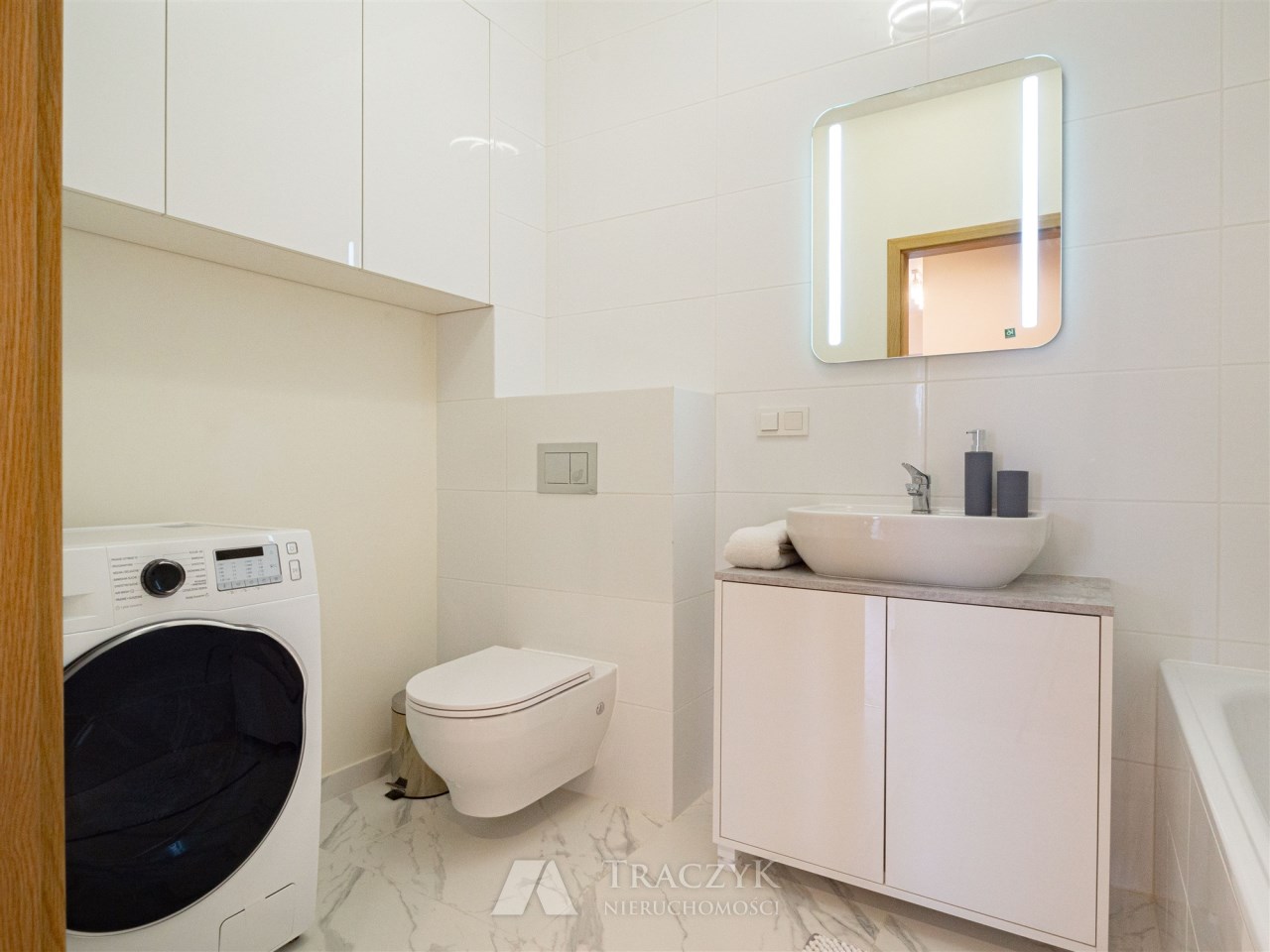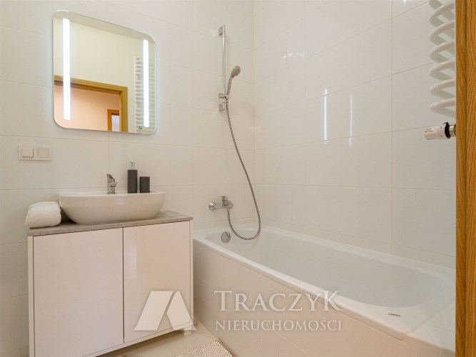 - łazienka z wanną i słuchawką prysznicową, umywalka z szafką podumywalkową, dobrze doświetlone lustro, wc, pralka Samsung,