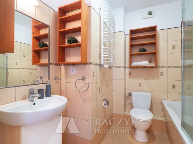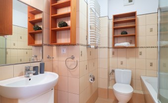 W łazience znajduje się wanna z funkcją prysznica, pralka oraz półki łazienkowe. Na miejsce do przechowywania przewidziana została spora szafa z drzwiami przesuwnymi w przedpokoju.