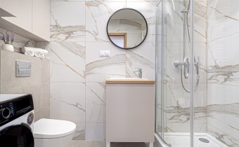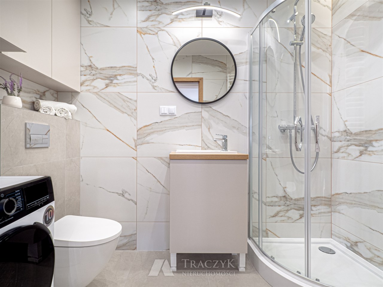 • łazienka z prysznicem, lustrem, umywalką, nowoczesną pralką i szafkami do przechowywania,