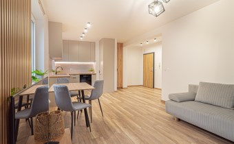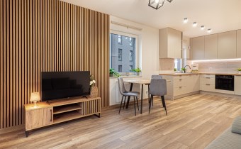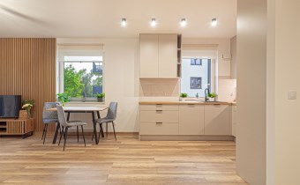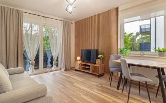 • przestronny salon z aneksem kuchennym, wyposażonym w nowoczesne meble i nowy sprzęt AGD: płytę indukcyjną, piekarnik elektryczny, okap kuchenny, lodówko-zamrażarkę, zmywarkę. W części jadalnianej znajduje się stół z krzesłami, w części dziennej wygodna rozkładana sofa, stolik RTV z telewizorem,