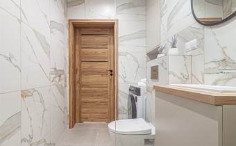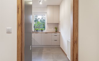 - osobna kuchnia wyposażona w meble kuchenne oraz nowoczesny sprzęt AGD: płytę indukcyjną, piekarnik elektryczny, okap kuchenny, lodówko-zamrażarkę, zmywarkę,