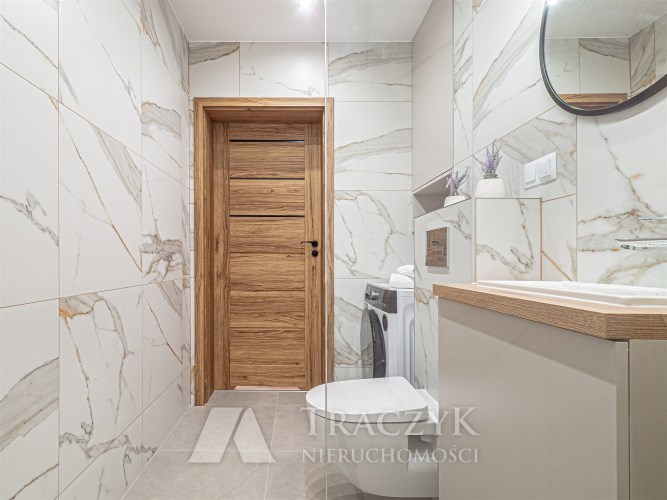 - łazienka z prysznicem, lustrem, umywalką, nowoczesną pralką i szafkami do przechowywania,