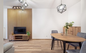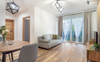 - przestronny salon wyposażony w nowoczesne meble takie jak: w części jadalnianej - stół z krzesłami i komoda, w części dziennej - wygodna rozkładana sofa, stolik RTV z telewizorem,