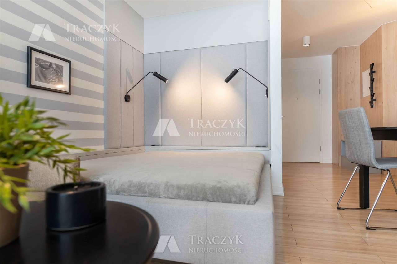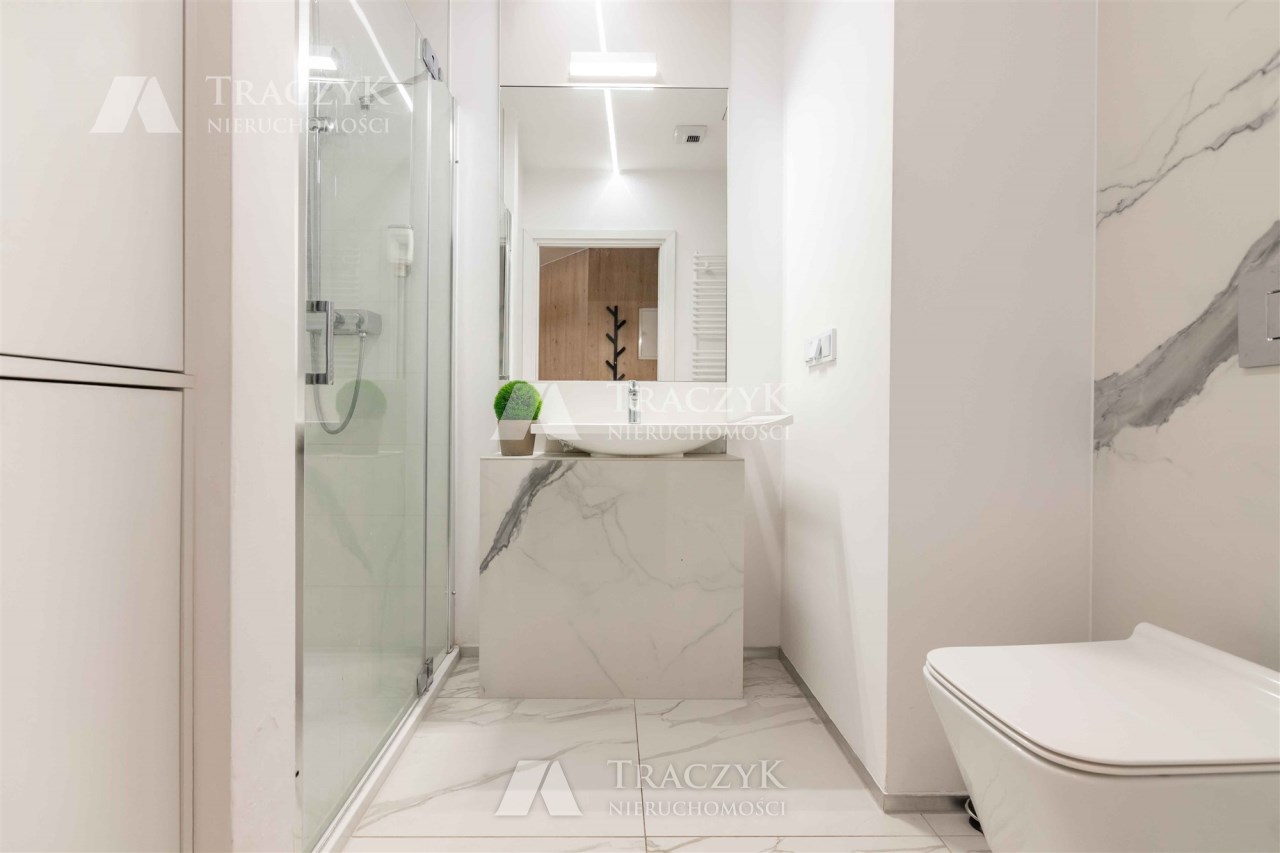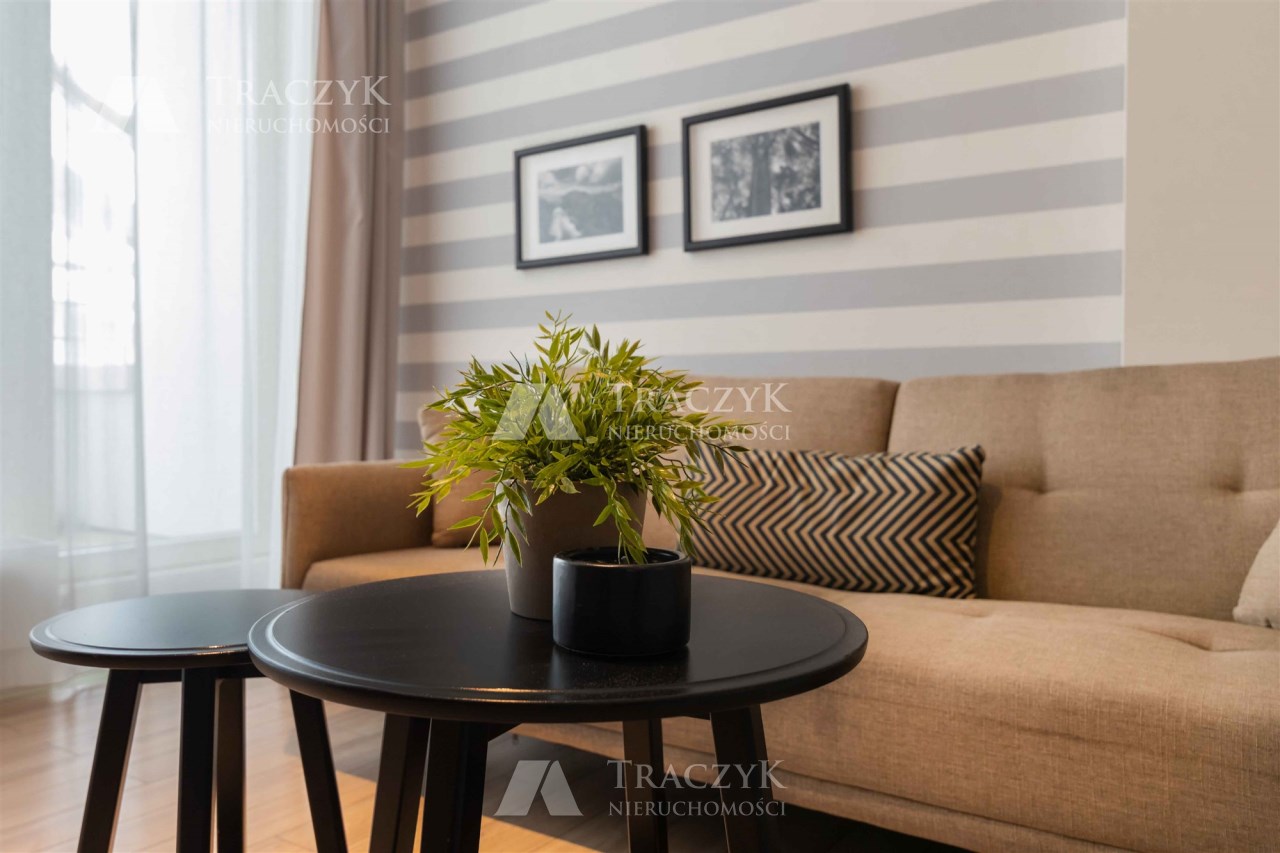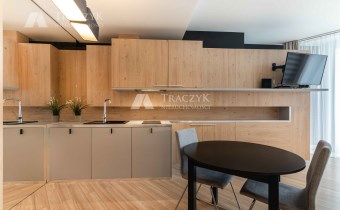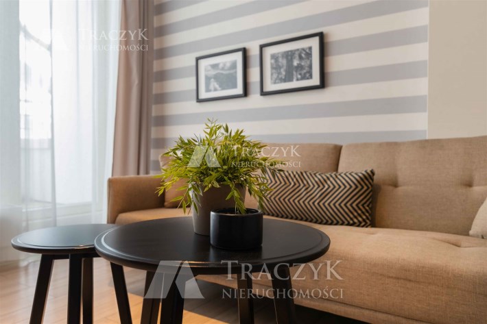 Kawalerka znajduje się na czwartym piętrze w apartamentowcu oddanym do użytkowania w 2016 roku z widną. Mieszkanie składa się z przedpokoju, salonu z aneksem kuchennym oraz jadalnią, łazienki z toaletą, garderoby oraz balkonu. W całym apartamencie można korzystać z klimatyzacji a prywatność zapewniają ciemne zasłony oraz widok na mniejsze patio budynku. Położenie apartamentu zapewnia komfort wypoczynku oraz ciszę pomimo lokalizacji w samym centrum miasta. Kawalerka wyposażona została: