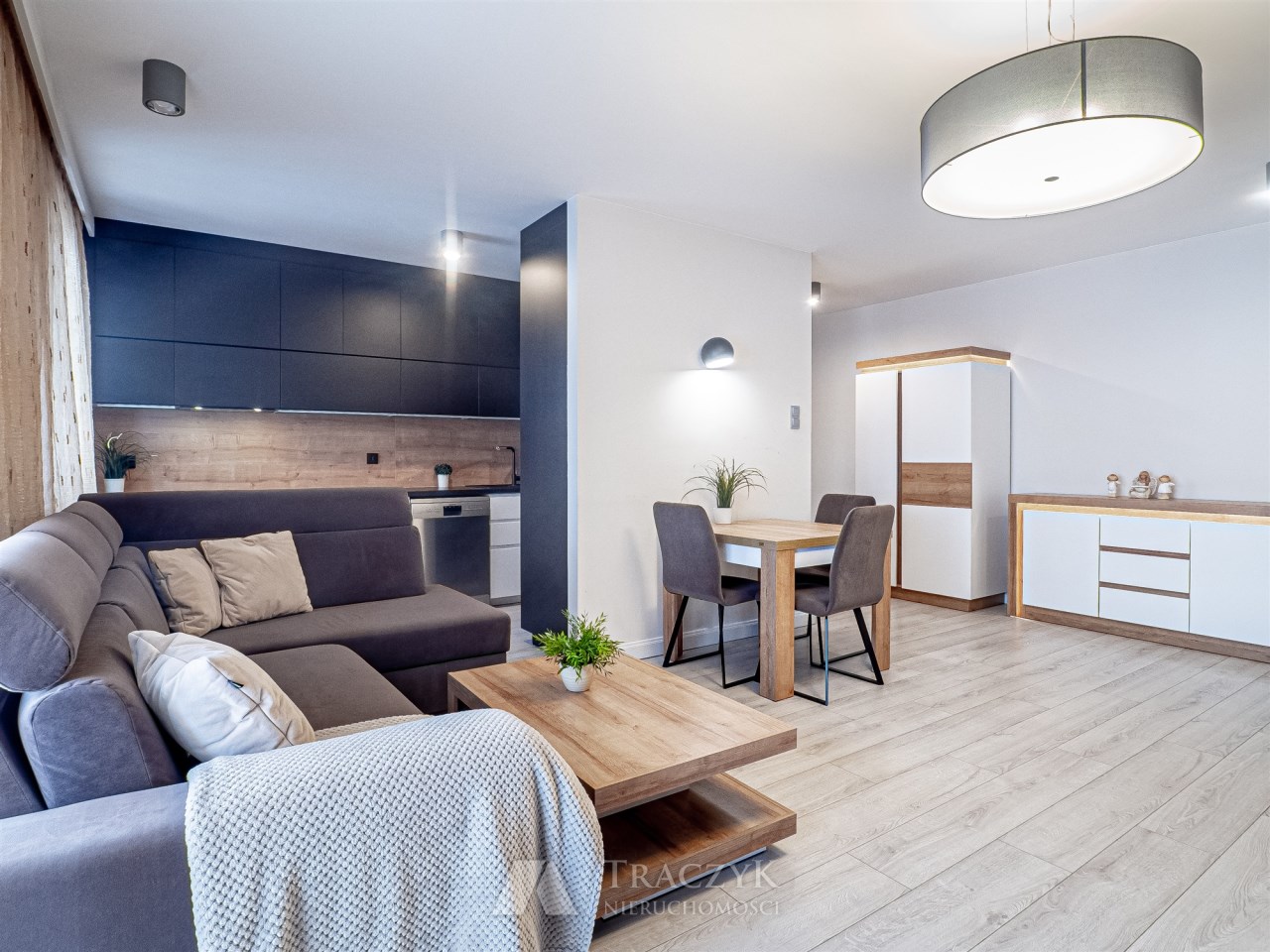 • przestronnego salonu z aneksem kuchennym – salon wyposażony w wygodny, rozkładany narożnik, stół z krzesłami, komodę oraz szafkę RTV (meble z podświetleniem). Z salonu wyjście na balkon. Aneks kuchenny z podświetlanymi szafkami, w pełni wyposażony w wysokiej jakości sprzęty marki Samsung: lodówkę z zamrażarką, mikrofalówkę i piekarnik w zabudowie oraz zmywarkę. Duża ilość miejsca do przechowywania. Na wyposażeniu również podstawowe przybory kuchenne (garnki, sztućce, talerze itp.),