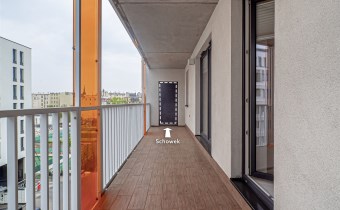 Do mieszkania przynależą dwa miejsca parkingowe w garażu podziemnym oraz duży balkon (wyjście z salonu i pokoju nr 1). Na balkonie znajduje się dodatkowa, zamykana przestrzeń – schowek.