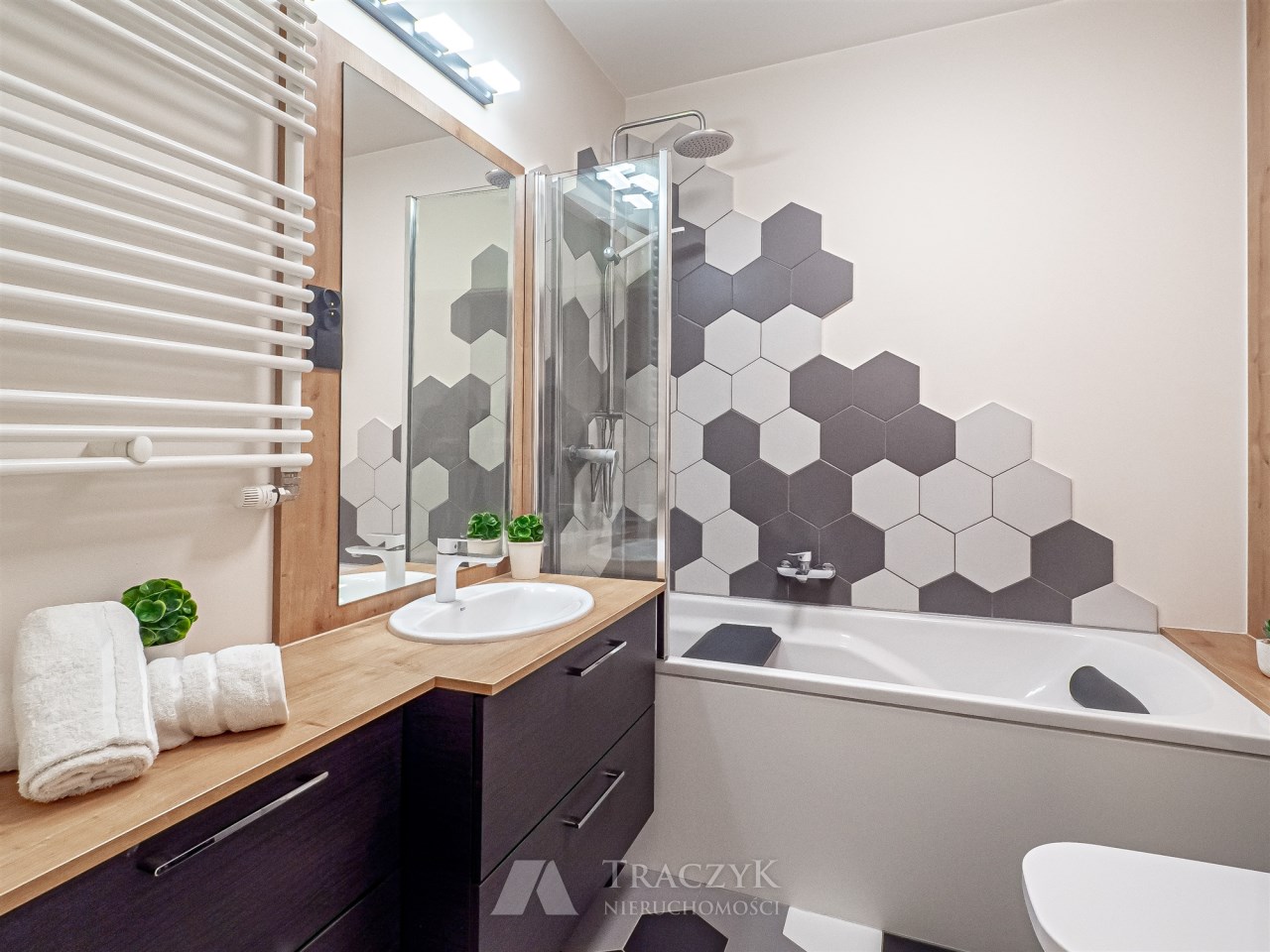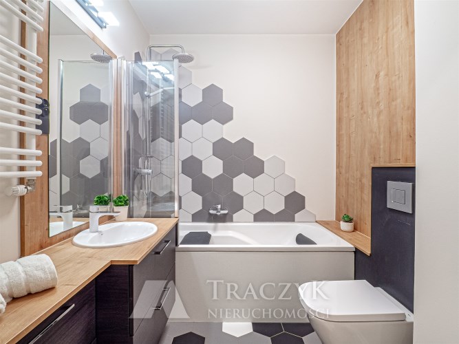 • łazienka z WC – wanna z funkcją prysznica, toaleta oraz szafki.